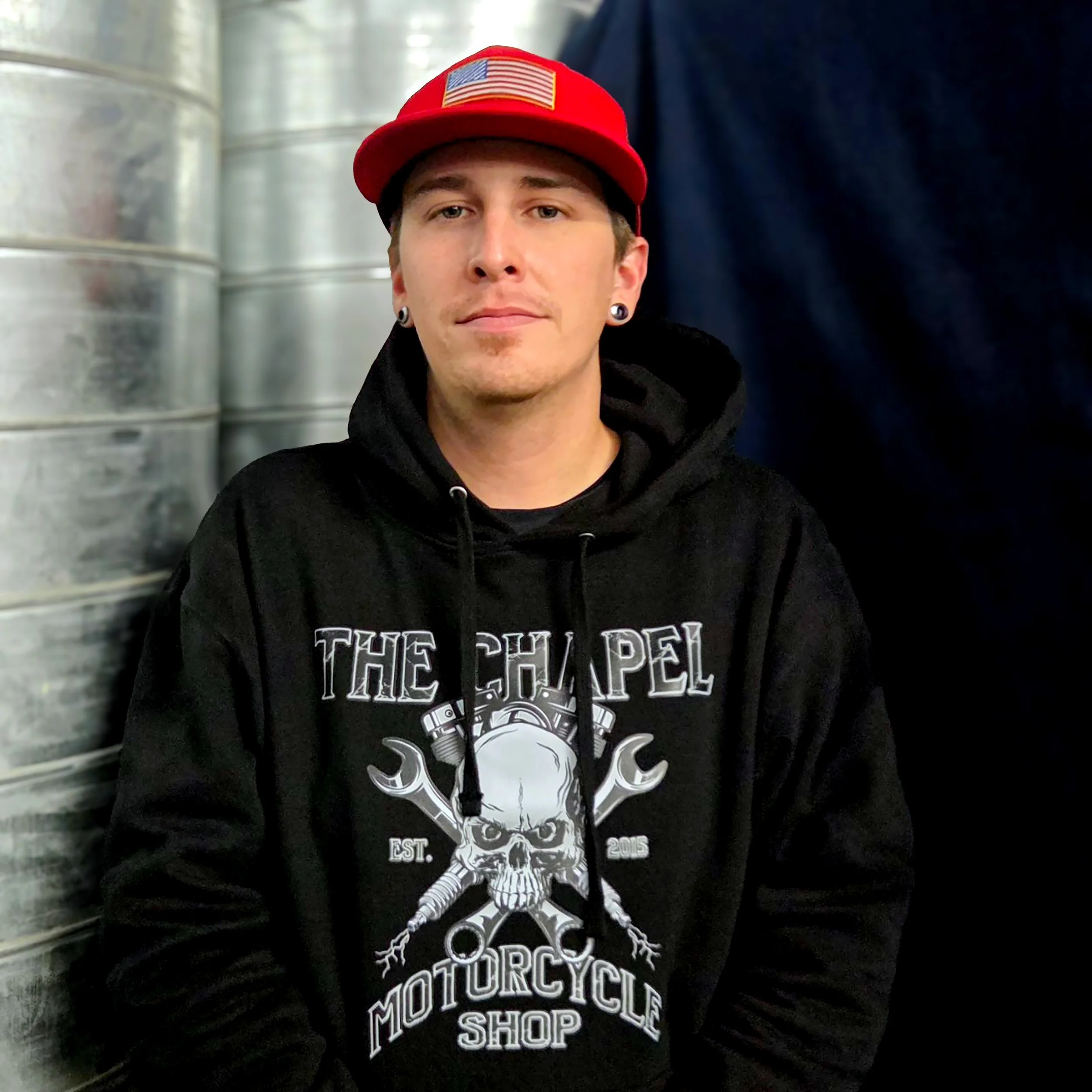 AJ joined our production team in winter 2024, helping craft apparel for the showroom floor while improving quality and workflow efficiency. He also supports marketing efforts, helping showcase the team’s work and highlighting what makes The Chapel unique. Dedicated to making every piece look its best, AJ thrives on the hands-on nature of the job. And for him, it’s the team and being surrounded by motorcycles every day that make the work especially rewarding.